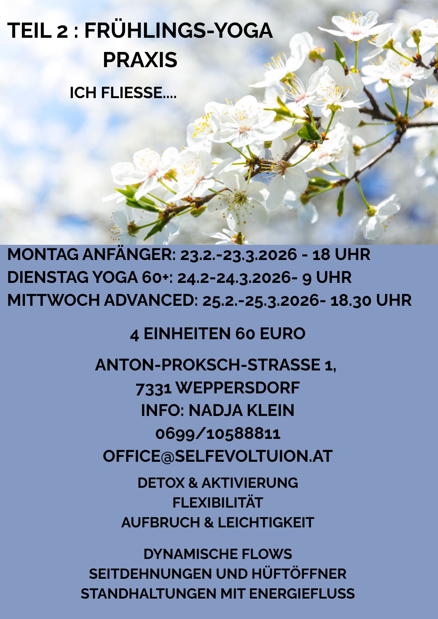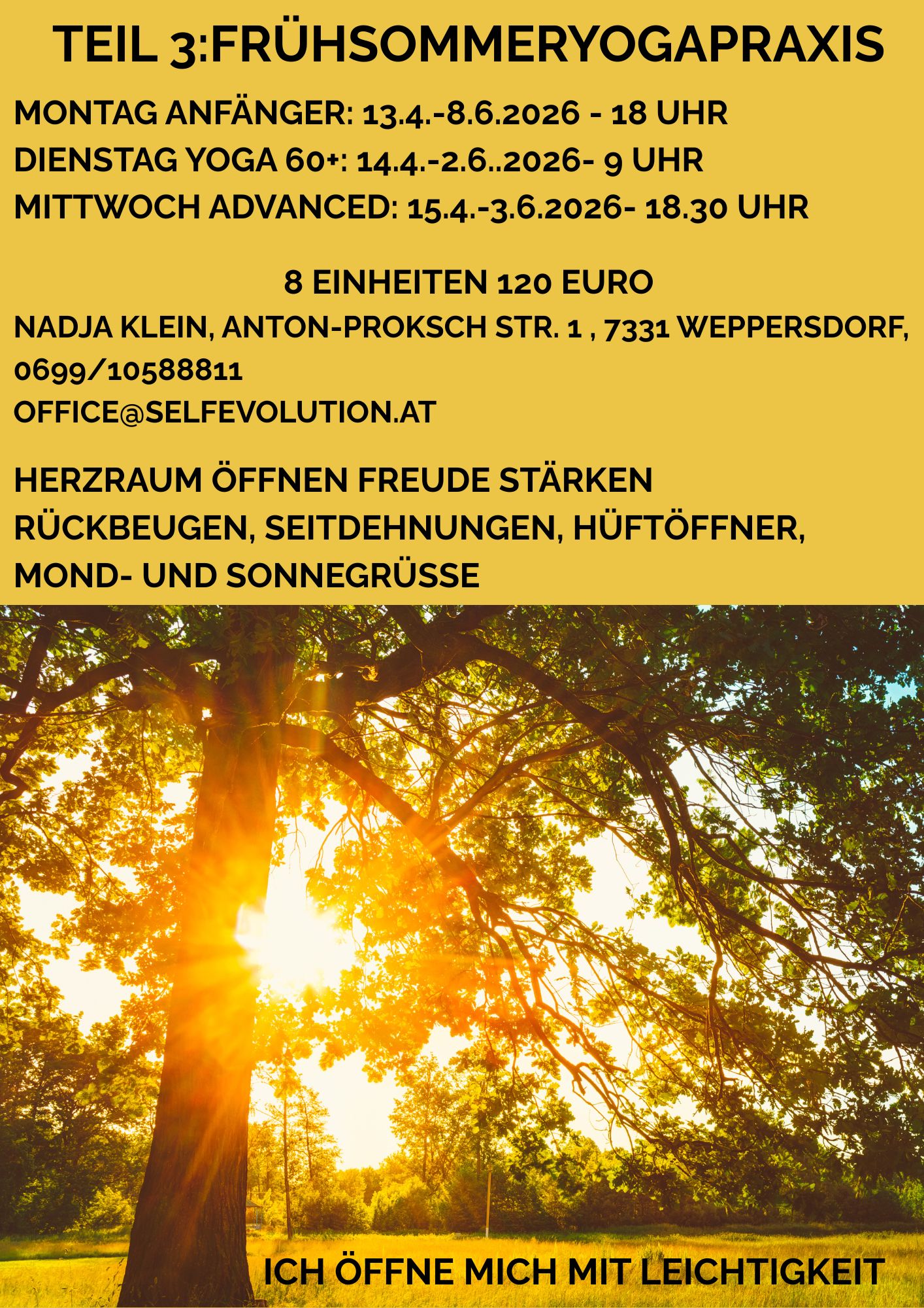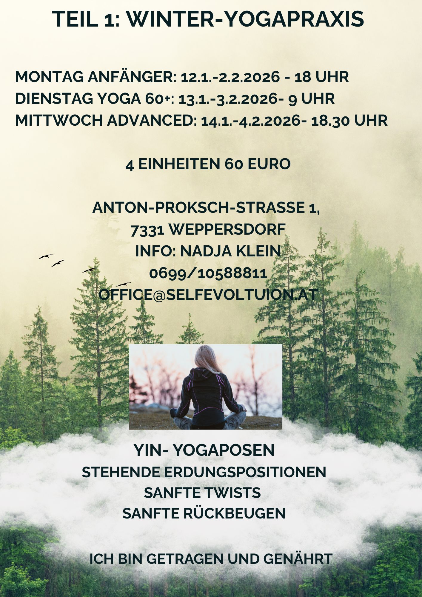 Montag 18 Uhr Weppersdorf: Anfänger/innen und Wiedereinsteiger/innen Dauer: 75 min ( Asanapraxis, Atemübungen, Entspannung) Ort: Praxis Ergolution Weppersdorf